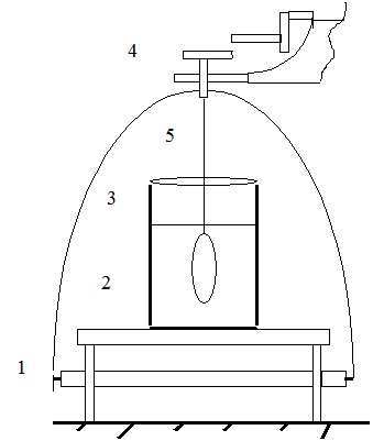 На рисунке изображено гидростатическое взвешивание. Над чашкой 1 весов помещают скамью 2, на которую ставится стакан 3 с жидкостью. Взвешиваемое тело подвешивается к плечу коромысла 4 весов за проволочку 5, таким образом, чтобы целиком быть погруженным в жидкость, не задевая при этом дна и стенок стакана 3.
