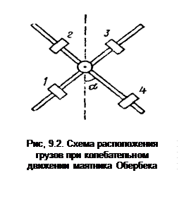 Постановка задачи. Маятника Обербека (как это показывает его название) дает возможность исследовать колебания массивного тела относительно неподвижной горизонтальной оси. Сместим один из грузов m дальше от оси вращения (рис.9.2). Тогда маятник, отклоненный от положения равновесия, будет совершать колебания. Определяя период колебания с помощью секундомера, можно проверить формулу для периода колебаний физического маятника.