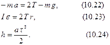 Постановка задачи. Определить среднюю силу натяжения нитей в маятнике Максвелла при его равноускоренном движении и во время «рывка», когда маятник достигает нижней точки траектории. Масса маятника m, радиус вала r; путь h маятник проходит за время t (рис 10.1).