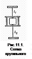 Крутильный маятник (рис.11.1) состоит из рамки, закрепленной на растяжках (тонких упругих проволоках). В рамке может быть закреплено твердое тело с центром масс, лежащим на оси вращения. Если повернуть рамку на малый угол j от положения равновесия и отпустить, то она начнет совершать гармонические крутильные колебания.