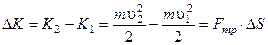 Кинетическая энергия тела уменьшается (К2<К1). Уменьшение кинетической энергии равно работе силы трения, что можно бы было сразу написать на основании закона сохранения и превращения энергии.