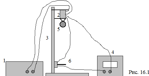 Установка для проведения опыта состоит из источника постоянного тока 1, предназначенного для питания электромагнита 2, укрепленного на штативе 3 и выключателя 6, установленного на некотором расстоянии под электромагнитом. Этот выключатель предназначен останавливать электронный секундомер 4 в момент удара шарика 5 по лопатке 6, а включение секундомера осуществляется в момент выключения магнита. Определив время падения шарика с различных высот и зная эти высоты, можно найти ускорение силы тяжести. Электрическая схема установки приведена на рисунке 1.