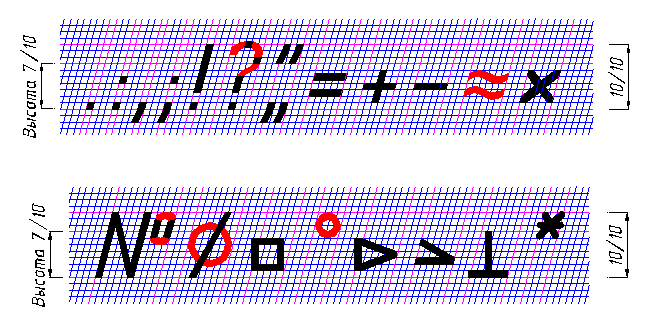 На рис. 1.4 приведены некоторые знаки, применяемые в надписях. Для размеров, приводимых в технических требованиях, примечаниях и пояснительных надписях на поле чертежа, обязательно указываются единицы измерения.