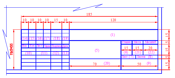 Основные надписи. Основные надписи (специальный штамп) располагают в правом нижнем углу конструкторских документов. На формате А4 они располагаются только вдоль короткой стороны листа (см. рис. 1.1). Размеры и заполнение основной надписи приведены на рис. 1.5.