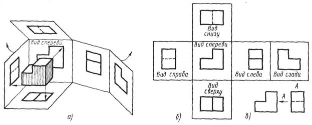 Стандартное расположение видов показано на рис. 2.1. Это – развёрнутые грани параллелепипеда, внутри которого помещают проецируемый предмет (рис 2.1, а, б). Поясняющие надписи на чертежах не делают. При ином расположении вида его оформляют по рис. 2.1, в: показано стрелкой направление проецирования и дана надпись над соответствующим изображением А.