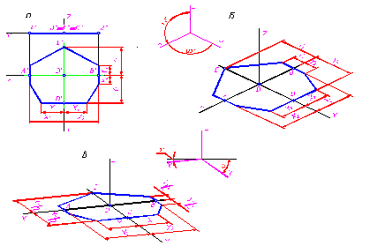 2. Соединив полученные вершины отрезками прямых в последовательности, определяемой их расположением в ортогональных проекциях, получают аксонометрическую проекцию данной плоской фигуры.