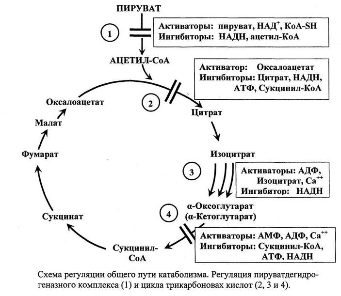 Общим принципом регуляции пируватдегидрогеназного комплекса (ПДК) и цикла трикарбоновых кислот (ЦТК), процессов независимых, но функционально тесно связанных, является то, что они совместно активируются при низком энергетическом потенциале клетки. И совместно ингибируются при высоком энергетическом клеточном потенциале.
