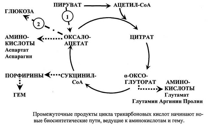 Другая роль цикла трикарбоновых кислот состоит в том, что он поставляет промежуточные продукты для процессов биосинтеза (рис. 10).