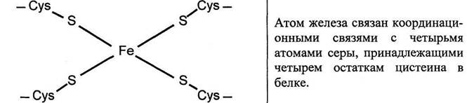 В Fe2S2 центре каждый из двух атомов железа связан координационными связями с двумя атомами неорганической серы и двумя остатками цистеи-на в белке.