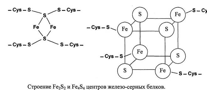 К другому типу негемовых белков - переносчиков электронов относят железо-серные белки (FeS). В них атомы железа связаны с сульфгидрильными группами остатков цистеина белка, а также сульфгидрильными анионами, образуя железо-серные комплексы или центры.