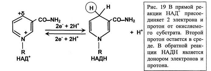 НАД-зависимые дегидрогеназы содержат НАД+ в активном центре и при взаимодействии с субстратом отбирают от него два электрона и протон, которые присоединяются к молекуле НАД+ образуя НАДН (Рис. 18). Поскольку НАД+ или НАДН находятся в активном центре дегидрогеназ не постоянно - их рассматривают в качестве вторых субстратов реакции и переносчиков электронов.