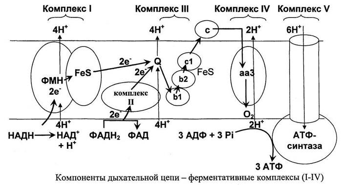 Электроны поступают в дыхательную цепь различными путями. При окислении НАДН в комплекс I происходит перенос 2-х электронов от ФМН и FeS-центров на убихинон (Q). При этом через комплекс I переносятся 4 Н+.