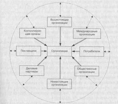Структуру внешней среды организации образуют входящие в нее элементы и их взаимосвязи (см. рис. 4.1). К таким элементам прежде всего относятся поставщики, потребители, деловые партнеры, вышестоящие организации (в т. ч. материнские компании), нижестоящие организации (в т. ч. дочерние предприятия, представительства и филиалы), контролирующие органы, международные организации, общественные организации (профсоюзы, политические партии, общественные движения) и т. п.