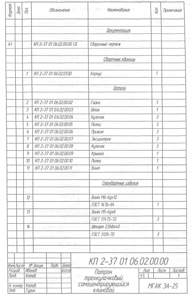Пример спецификации к сборочному чертежу