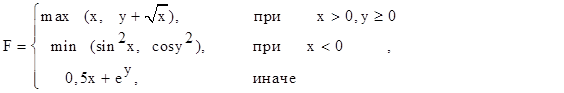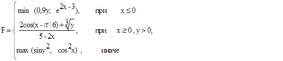 f=min(0.5*x-2*pow(sin(y),2),exp(y)); // Вызов функции min puts("F=min(0.5*x-2*pow(sin(y),2),exp(y))");