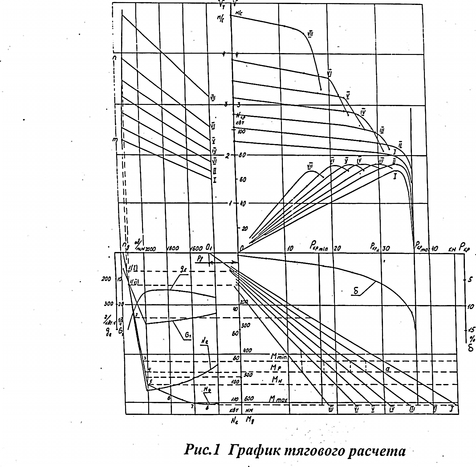 Необходимо также представить, при каких условиях происходит процесс переключения передач. Для этого рассмотрим диаграмму (лучевой график), изображенную на рис.1 в правой нижней четверти. Предположим, что трактор работает на второй рабочей передаче (см. луч II ). При возрастании нагрузки на крюке увеличивается Рк, т.к. двигатель вырабатывает больший крутящий момент. В т. а крутящий момент достигает расчетного значения Мр. Чтобы предотвратить дальнейшее увеличение момента, нужно переключиться на первую передачу.