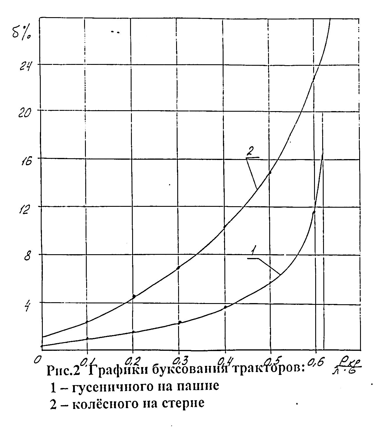 для колесного (график 2) и гусеничного (1) с/х тракторов на расчетном виде почвы. Графики построены по экспериментальным данным и рекомендуются к использованию при выполнении тягового расчета.