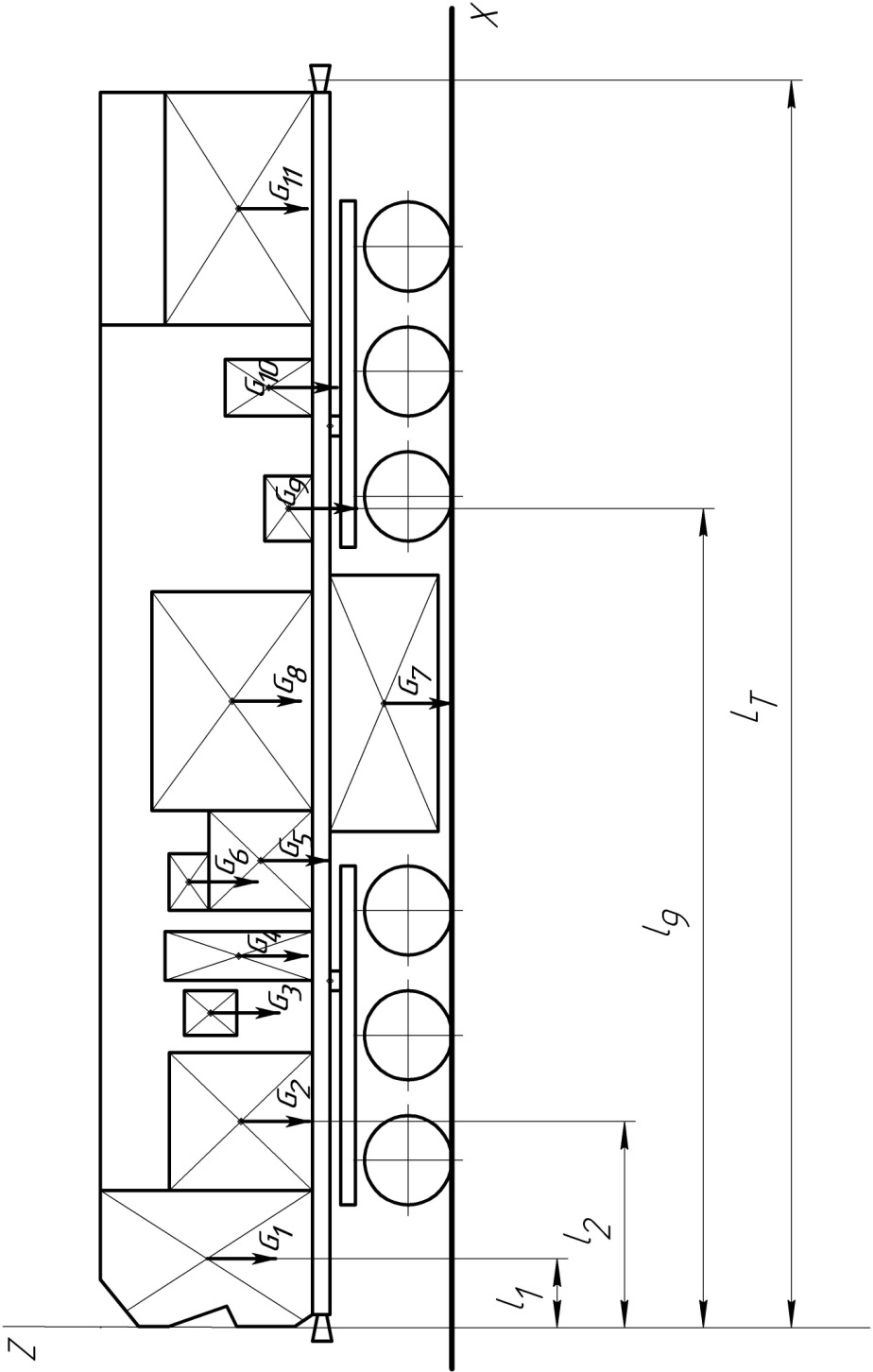 - на схеме компоновки отмечаются расстояния от векторов сил тяжести узлов Gi до оси моментов Z и обозначаются li; желательно, чтобы, например, величине G5 соответствовало расстояние l5 и т.д.;