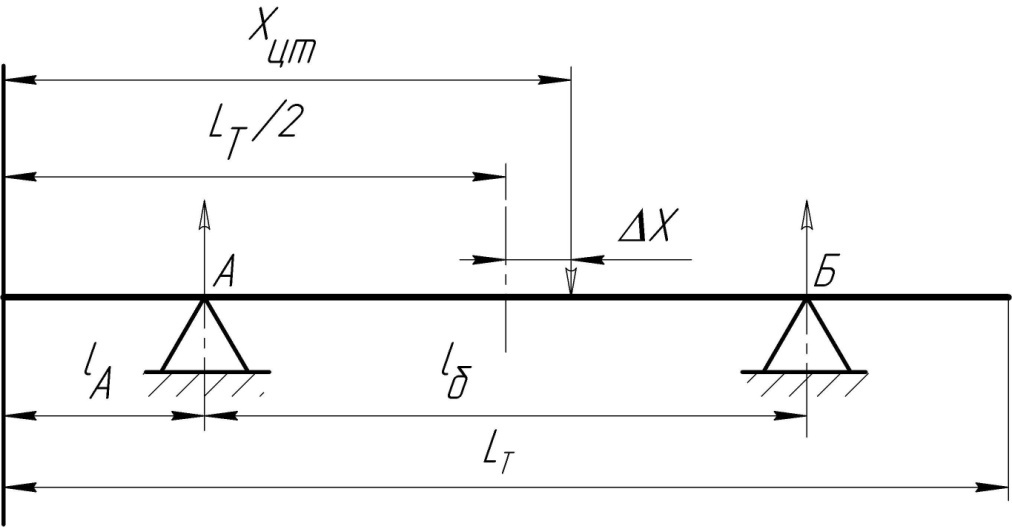 Для определения нагрузок на тележки используют уравнения статики. Раму тепловоза представляют в виде балки, расположенной на двух мнимых опорах (центры шкворней). Нагрузки на тележки заменяют реакциями РА и РБ мнимых опор (рис.6). На схеме также указываются геометрическая середина тепловоза (LТ /2) и координата Хцт центра тяжести