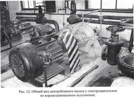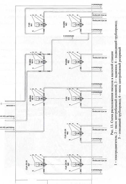 В насосной станции установлены основные и резервные центробежные насосы (рис. 12). Схема расположения насосов с обвязкой приведена на рис.13. Привод насосов осуществляется от электродвигателей, которые имеют взрыво-защищенное исполнение в соответствии с классом зоны по ПУЭ. Кроме того, насосная оборудована вакуумными поршневыми насосами, предназначенными для отсоса газов и паров из трубопроводов и центробежных насосов, для заполнения их перекачиваемой жидкостью и обеспечения неразрывности струи при перекачке центробежными насосами нефтепродуктов с высокой упругостью паров.