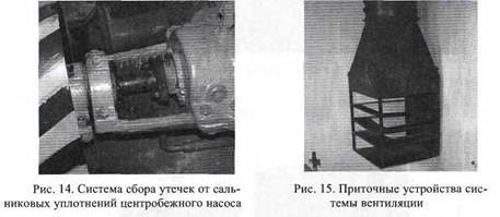 Для исключения пролива нефтепродуктов на пол, в местах сальниковых уплотнений предусмотрена специальная система сбора утечек (рис. 14). А для исключения образования взрывоопасных концентраций в объеме насосной станции используют общеобменную и аварийную вентиляцию (рис. 15).