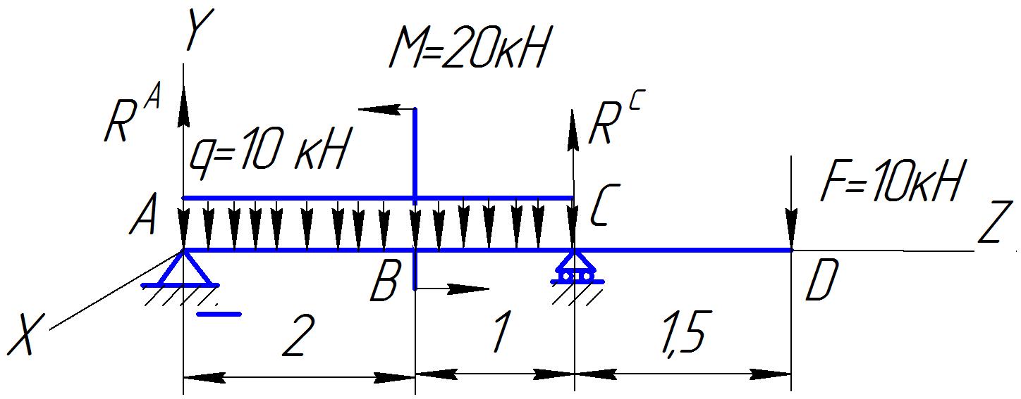 Так как все заданные нагрузки расположены исключительно в вертикальной плоскости (плоский поперечный изгиб) и не дают проекций на ось z, то опорные реакции будут тоже только вертикальными.