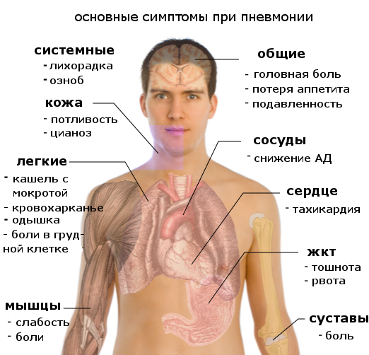 Воспаление вызывает появление общих и местных симптомов (рис.1), степень выраженности которых зависит от иммунного статуса пациента и от объема поражения легочной ткани.