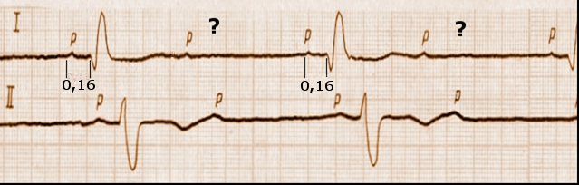 · Мотбиц I. Каждое сердечное сокращение характеризуется удлинением интервала P-Q по сравнению с предыдущим. Интервал удлиняется до тех пор, пока одно из сердечных сокращений не выпадет, а вместо него на ЭКГ регистрируется удлиненный интервал R-R (периоды Самойлова - Венкебаха). После этого опять регистрируется серия сокращений с последовательным удлинением интервалом P-Q (рис.16).