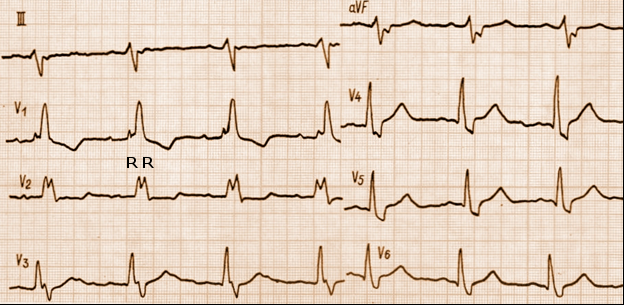 Блокада ножек пучка Гиса. Блокада ножек относится к внутрижелудочковой блокаде. Следовательно, деформации будет подвергаться желудочковый комплекс QRS. Блокада на пути импульса может возникать как в левой, так и в правой ножке пучка Гиса. При этом сначала импульс проходит по неблокированной ножке, вызывая возбуждение только в одной половине сердца, а затем уже распространяется и на другую половину. Поэтому желудочковый комплекс представлен двумя зубцами R (М-образное расщепление). Для блокады правой ножки пучка Гиса это расщепление регистрируется в отведениях V1,2. Помимо этого отмечается депрессия сегмента ST в отведении V1, реже III (рис. 19).