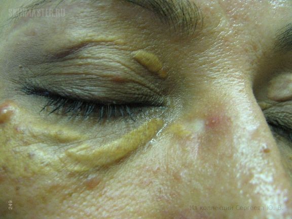· ксантомы и ксантелазмы (подкожное отложение холестерина в виде очаговых скоплений, вследствие нарушения жирового обмена), наиболее часто в области век и фаланг пальцев рук (рис. 24).