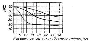 Рис. 17. Распределение твердости по длине образца при определении прокаливаемости по методу торцевой закалки трех марок стали: а – углеродистой; в – хромистой; с - хромоникельмолибденовой