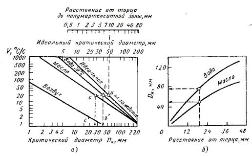 Определение критического диаметра по диаграмме рис. Рис. 18.б производится по схеме, указанной на этом рисунке. Для определения критического диаметра по номограмме Блантера (рис. Рис. 18.а) вводят понятие идеального критического диаметра, которым является наибольший диаметр образца, прокаливаемого насквозь. От идеального критического диаметра можно перейти к реальному критическому диаметру, используя номограмму, приведенную на рис. Рис. 18.б и схему, приведенную на этой номограмме. Для этого на верхней шкале находят полученные значения lторцевое, из этой точки опускают перпендикуляр до пересечения с линией «идеальное охлаждение». Через эту точку проводят горизонтальную линию до пересечения с линией «вода», «масло», «воздух». Проекции этих точек пересечения на нижнюю шкалу номограммы Блантера дают значение