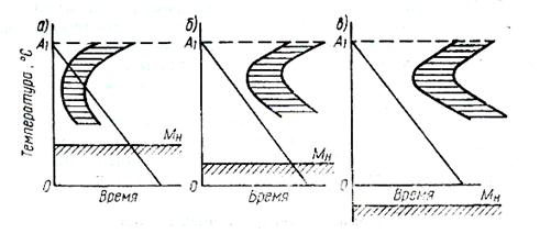 Рис. 24. Диаграммы изотермического превращения аустенита для перлитного (а), мартенситного (б) и аустенитного (в) классов сталей (схема)