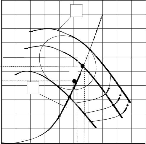 3. На кривую 1 наносится точка (В), характеризующая расчетные ве-личины депрессии и подачи вентилятора (Qвр, hвр).