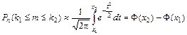 Интегральная теорема Лапласа. Если вероятность p наступления события A в каждом испытании постоянна и отлична от нуля и единицы (0 < p < 1), то вероятность того, что событие A появится в серии из n испытаний от k 1 до k 2 раз, приближенно равна