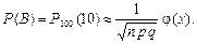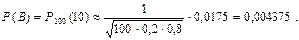 Для вычисления вероятности события В воспользуемся локальной теоремой Муавра-Лапласа. В данном случае: n = 100; p = 0,2; q = 0,8; m = 10;