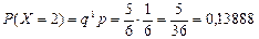 Пример 33 Производится подбрасывание игрального кубика до первого выпадения шести очков. Какова вероятность того, что первое выпадение шестерки произойдет при втором подбрасывании игрального кубика?