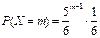 Решение. Условие задачи соответствует проведению независимых испытаний, в каждом из которых с вероятностью p = 1/6 может осуществиться событие A = {выпадение шести очков}. В этом случае неудача – выпадение любого числа от 1 до 5, успех – выпадение шести очков. Случайная величина X – число подбрасываний игрального кубика до выпадения шестерки, распределена по геометрическому закону. Возможные значения этой случайной величины: 1, 2, 3, …, m,…. Вероятность успеха p = 1/6, вероятность неудачи q = (1 – 1/6) = 5/6.