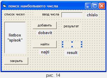 3. Установить остальные элементы формы в соответствие с рис. 14, свойства name для объектов указаны на рисунке рядом с ними.