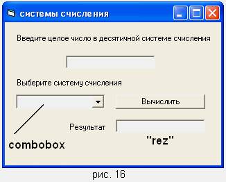 2. Внешний вид формы показан на рис. 16. Установить на форме объект ComboBox – раскрывающийся список (находится в наборе инструментов General). Этот объект предназначен для выбора какого-либо значения из заданного списка. Раскрывающийся список можно заполнить как во время работы программы, так и в листе свойств или в тексте программы. Содержимое выбранной позиции раскрывающегося списка хранится в его свойстве Text.