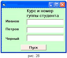Создать новый проект и программу для вывода на форму сведений о трех студентах: по запрашиваемой фамилии - курс и номер группы. Макет формы показан на рис. 26.