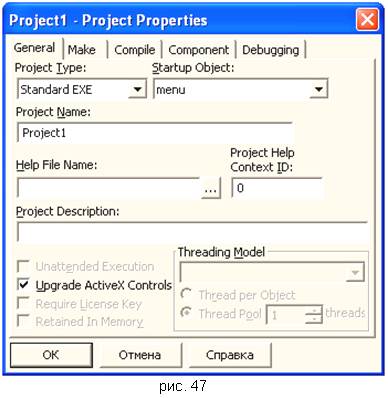 В любом проекте, имеющем более 1-й формы, одна из форм должна быть стартовой. По умолчанию стартовой является та форма, которая была первой создана в проекте. В том случае, если компилятор Visual Basic 6.0 не может определить стартовую форму, или требуется указать стартовую форму самостоятельно, следует воспользоваться командой Project Properties из меню Project. В диалоговом окне команды Project Properties на вкладке General (рис. 47) следует определить стартовую форму, выбрав ее по значению свойства Name в раскрывающемся списке Startup Object, затем нажать кнопку ОК.
