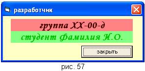 2. Добавить к проекту 3 формы. Макеты главной формы и форм – справочных окон показаны на рис. 55, 56, 57. (см. практ. р. № 5.1) Задать формам свойства Name: главной – menu, разработчик – razrab, о программе – oprog. Самостоятельно записать коды для кнопок закрыть в справочных окнах.