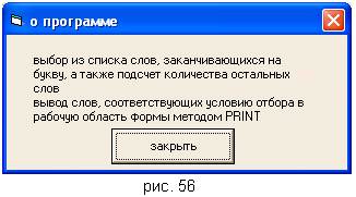 слов, выбрать из списка слова, заканчивающиеся на заданную букву, определить количество остальных (не заканчивающихся на букву) слов. Слова, соответствующие условию отбора должны выводиться в форму. Если список слов пуст, программа должно выводить на экран сообщение. Программа должна содержать 4 окна: главное и справочное окна, рабочее окно приложения, окно сведений о разработчике. Переключение между окнами должно осуществляться с помощью меню.