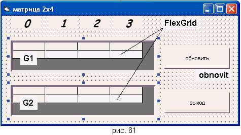 объекта FlexGrid. Свойства Name объектов FlexGrid – G1 и G2 (рис. 61). Объект FlexGrid имеет свойства: свойство Cols – количество столбцов, установить это свойство для обоих объектов равным 4; свойство Rows – количество строк, установить это свойство для обоих объектов равным 2. Содержимое объекта FlexGrid хранится в его свойстве Text.