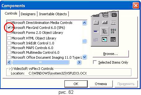 3. Установить на форме два объекта FlexGrid. Для этого вызвать контекстное меню на наборе инструментов General, выбрать команду Components. В окне Components на вкладке Controls (рис. 62) поставить галочку напротив позиции Microsoft FlexGrid Control 6.0 (SP6), нажать кнопку Применить, затем кнопку ОК. В наборе инструментов General появится кнопка