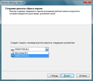 4. Выбрать из раскрывающегося списка устройство, на котором будет создан диск сброса пароля и нажать Далее.