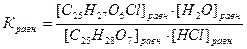 Для определения равновесной концентрации C25H27O6Cl измеряют оптическую плотность полученного раствора и по калибровочной кривой находят концентрацию этого вещества. Равновесные концентрации С25Н28О7 и HCl рассчитывают по разности между исходными концентрациями этих веществ и равновесной концентрацией C25H27O6Cl. Равновесную концентрацию воды можно принять равной концентрации чистой воды, а именно 55,56 моль/л. Это допустимо, поскольку применяемые в работе растворы достаточно разбавлены.