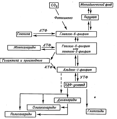 Рассматривая процессы биогенеза различных углеводов, легко обнаружить одну общую черту. Во всех случаях образование индивидуальных мономерных сахаров предшествует появлению гликозидных связей. Сначала синтезируются мономерные сахара, а затем они используются в форме макроэргических производных. При этом глюкозо-6-фосфат занимает ключевое положение в биосинтезе макроэргических предшественников углеводов (см. схему).