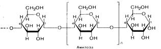 Амилоза имеет молекулярный вес в пределах 3х105-3х106 Да. Водные растворы амилозы весьма нестойки и при стоянии их них выделяются кристаллические осадки. В молекуле амилозы остатки глюкозы связаны a-гликозидными связями только между 1 и 4 углеродными атомами, образуя при этом длинную линейную цепочку:
